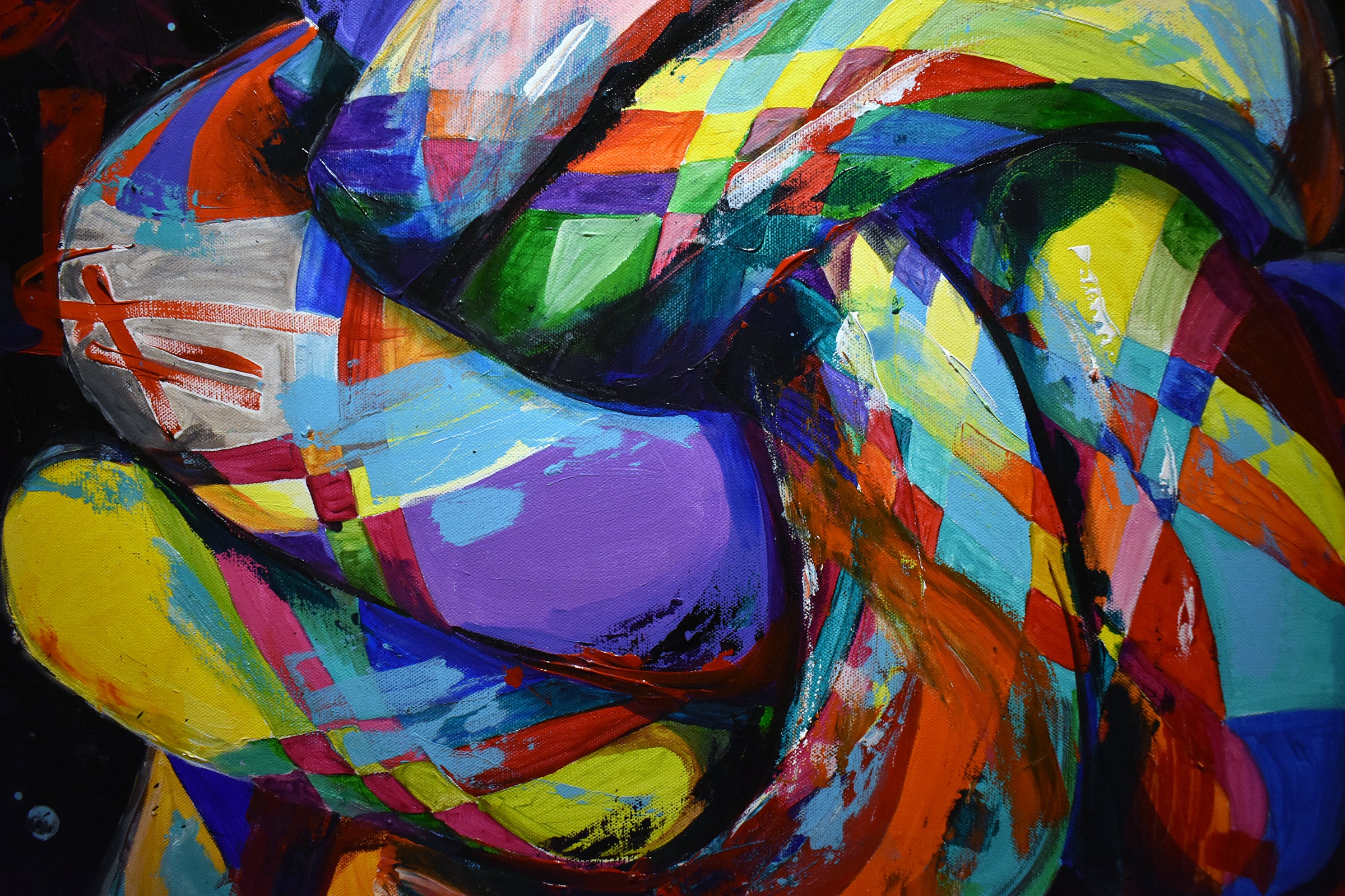 Tif's technique involves layering paint on stretched canvas or paper to achieving deep, rich pigmentation. She uses acrylic paint, pastels, colored pencils, markers, and sometimes found objects to add detail. She also employs brushes, palette knives, combs, and credit cards to create unique textures and layers, transforming her work.