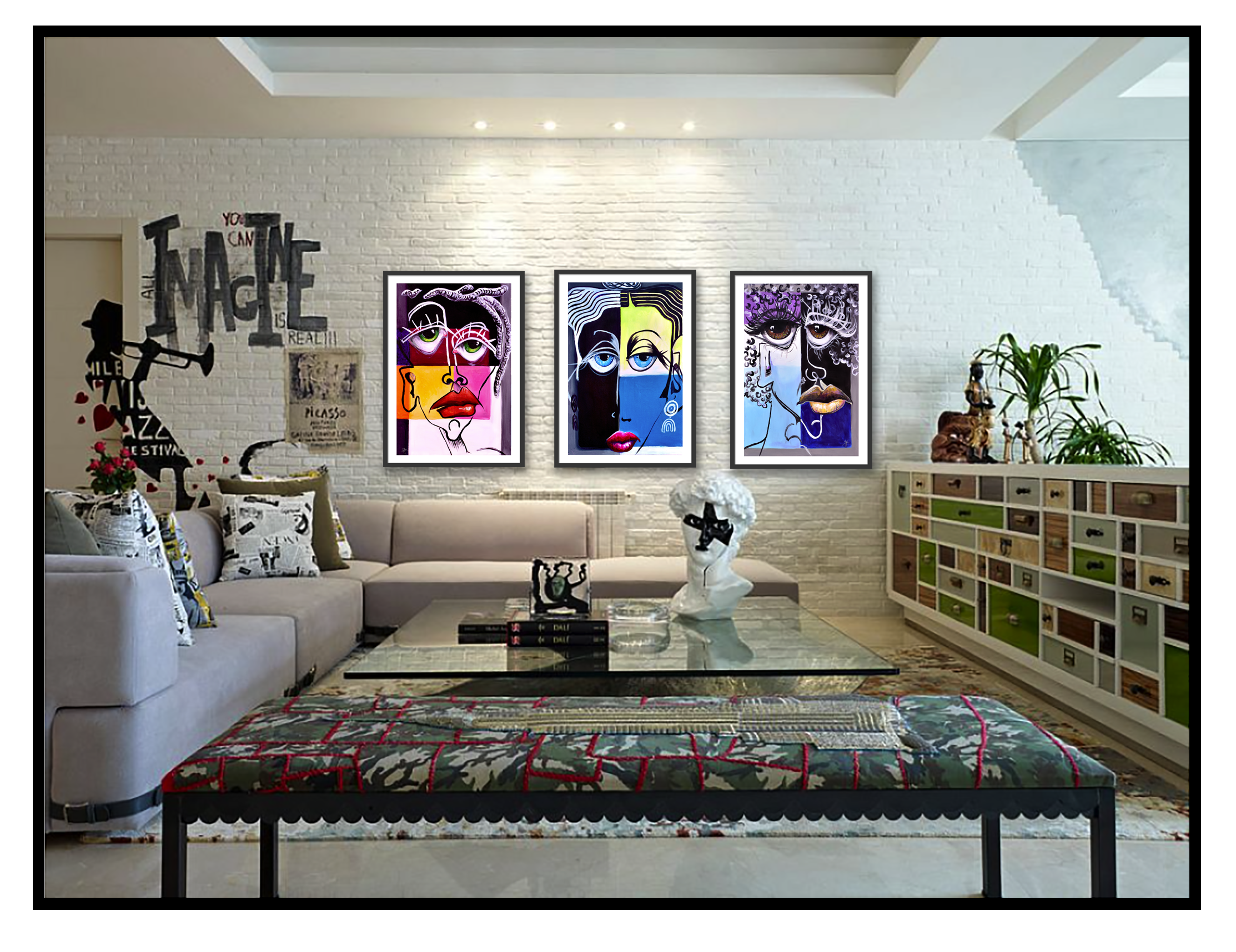 Each of these two character series, by artist, Tif Choate, were born out of the historic global pandemic of 2020. A.K.A. 'Rona. What  a wild start of the 20s! As streets quieted from stay-at-home orders across the nation, a subduing of epic proportions blanketed both ground and sky, all over the world. Feeling this heavy mood, Tif also took a major pivot in her practice. She began painting canvases with swaths of black, white and blocks of hues, mixed colors, two and three. Starting with ‘JoJoe’, these mesmeric characters revealed themselves, one-by-one as her brush spoke them into being. With their hypnotic, sleepy eyes and full, luscious lips, they claimed spaces within shapes; and lines of black and white, of contoured cheeks and brows on the canvas, they began to speak their stories.  Tif's family full of musicians, and history growing up in the rich musical cities of St. Louis and Memphis, catapulted these players into their rhythmic roles.  The Natty Swank Club joined the saga in early '22.