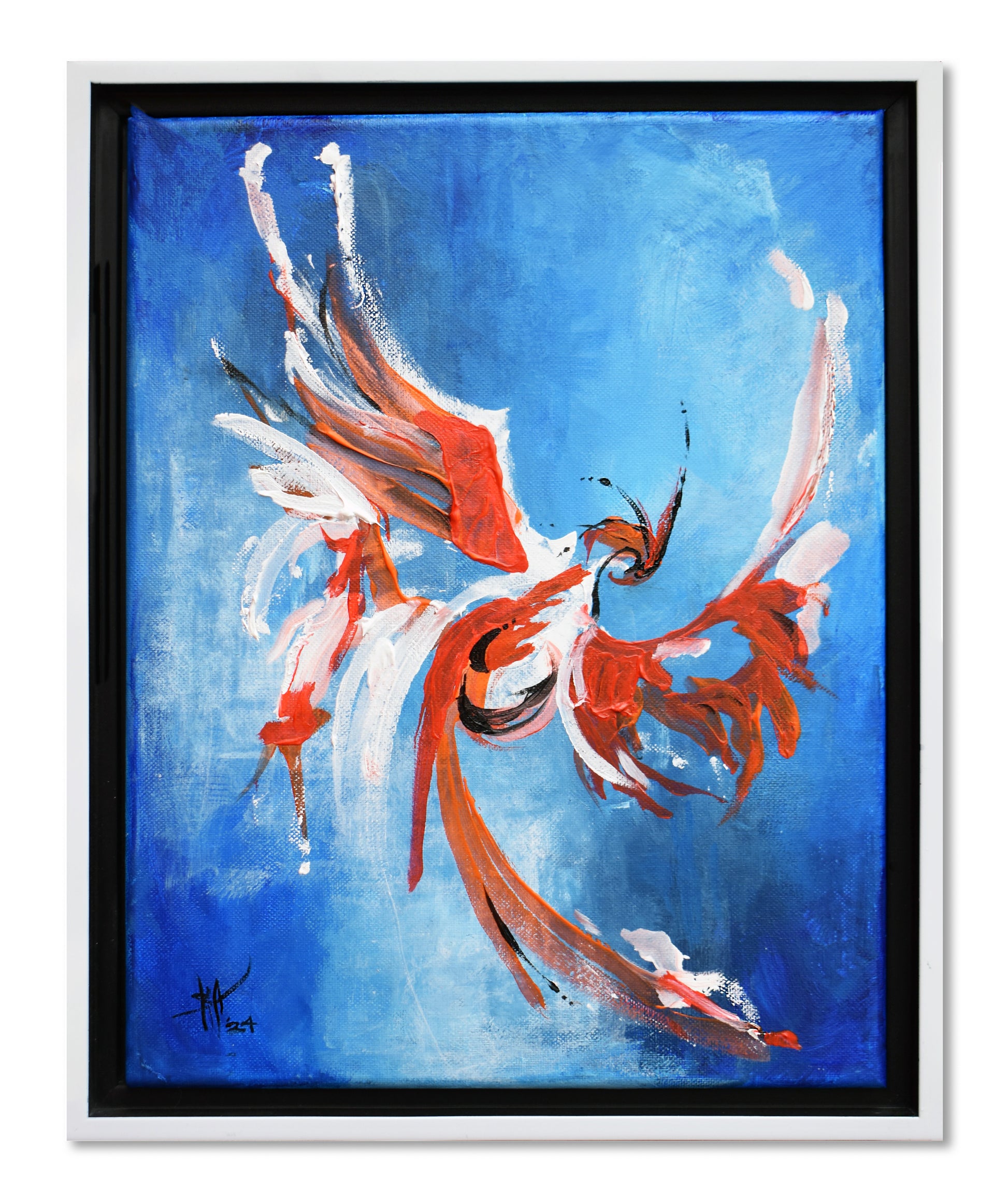 The contrasting hues of orange and white, juxtaposed against a sky filled with clouds, create a visually striking and assertive painting. I image hints of the flight of a majestic Phoenix, inflamed and in flight. This work was painted as part of a 5 painting series, Sky And... 2024 series, titled 'Fire Fly'.