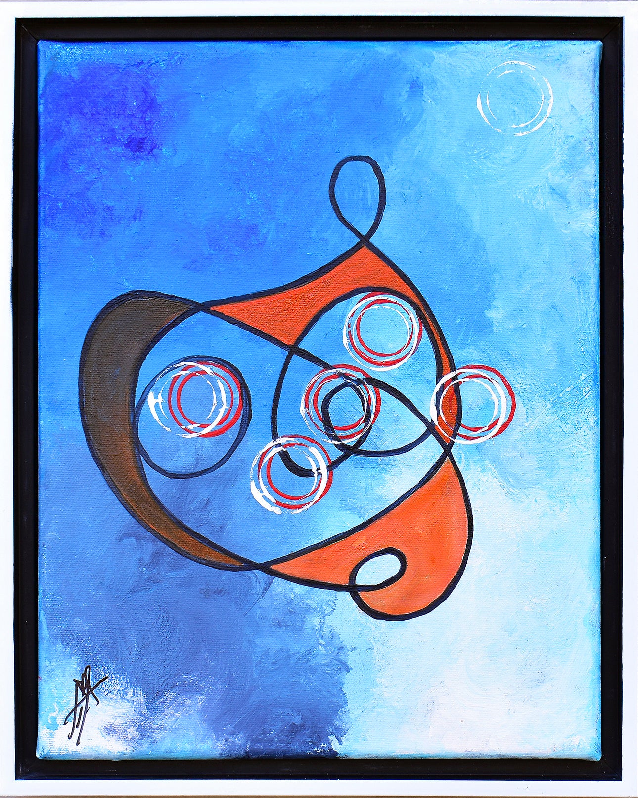 The artwork is created using heavy-bodied acrylic paint on stretched canvas, measuring 11 x 14 inches. The canvas is displayed in a 1 inch deep white floating frame with a black inset.