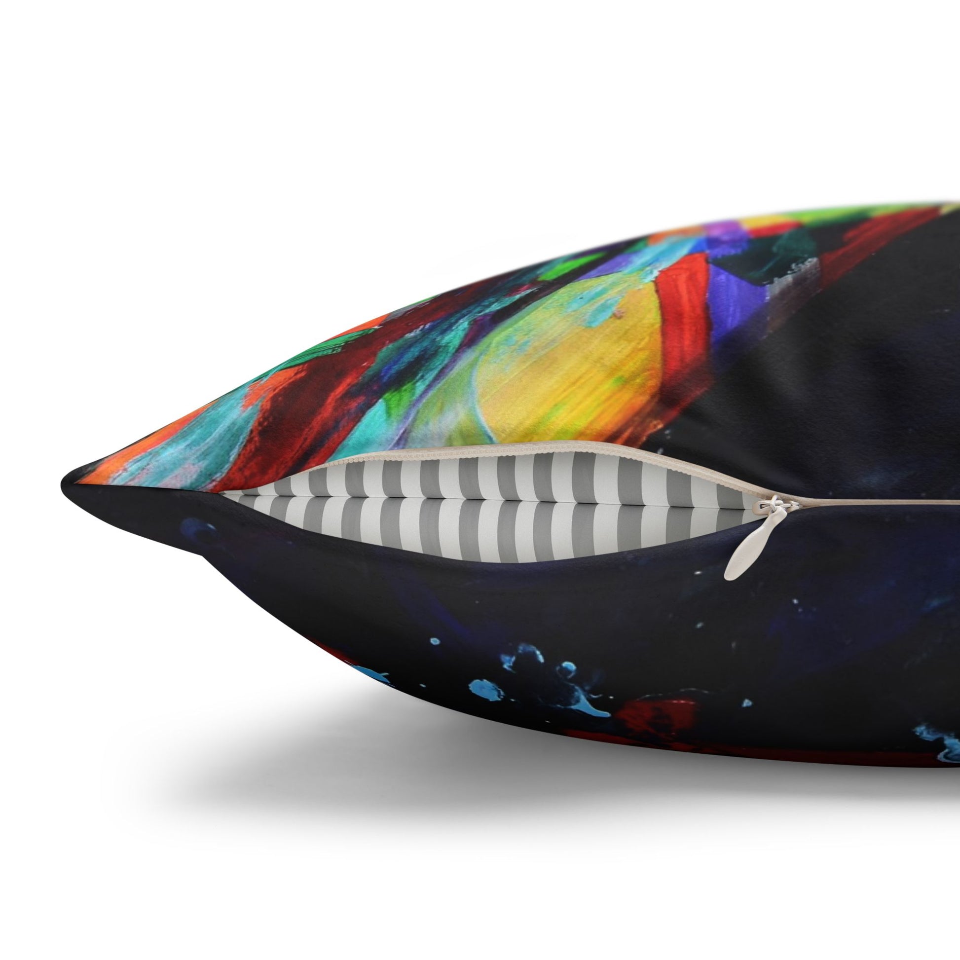 This 14" x 14" square pillow has brightly colored art design, '3 Fold Cord' by Tif Choate©