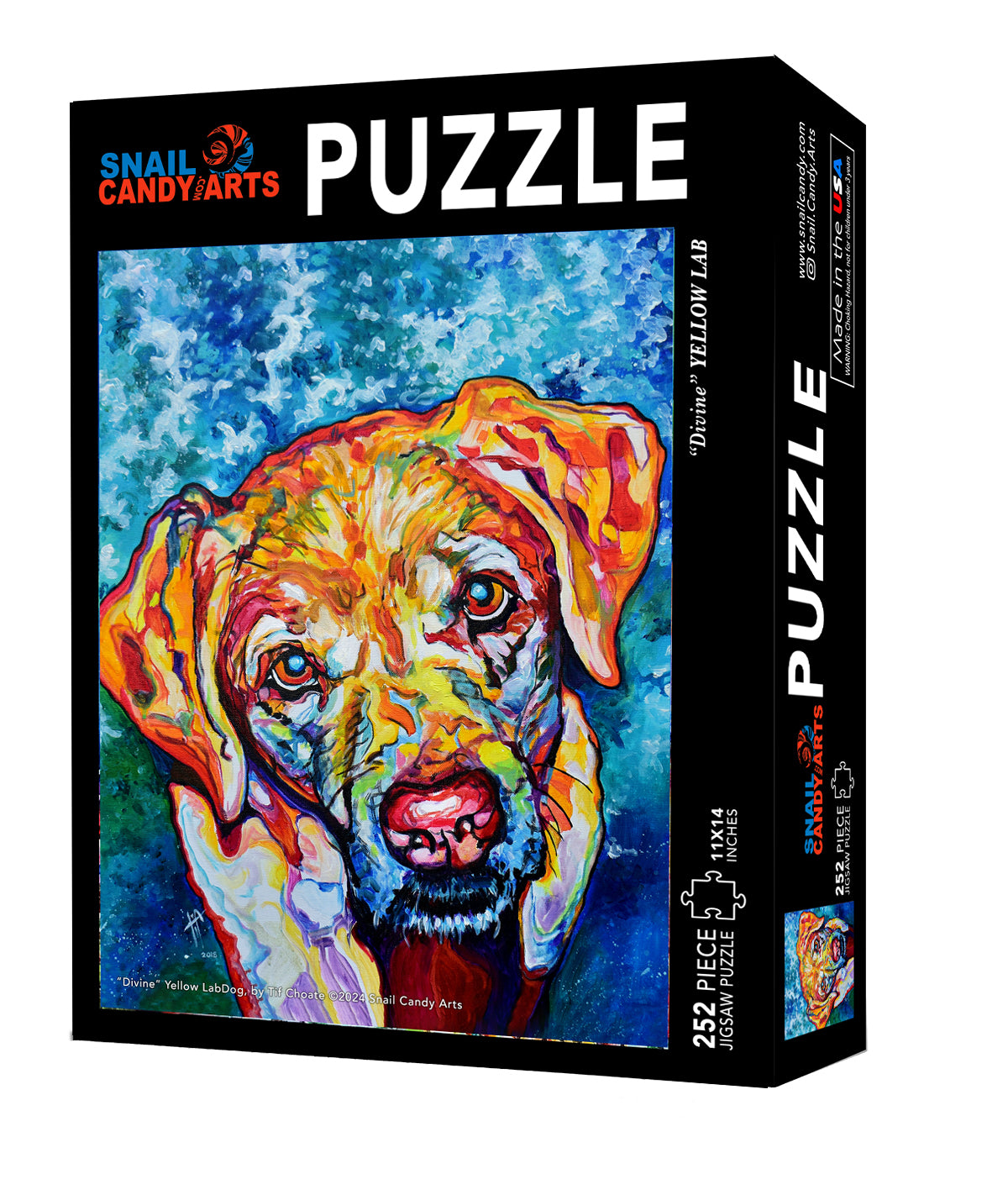 This puzzle depicts the original painting "Divine", a Yellow Lab dog portrait.