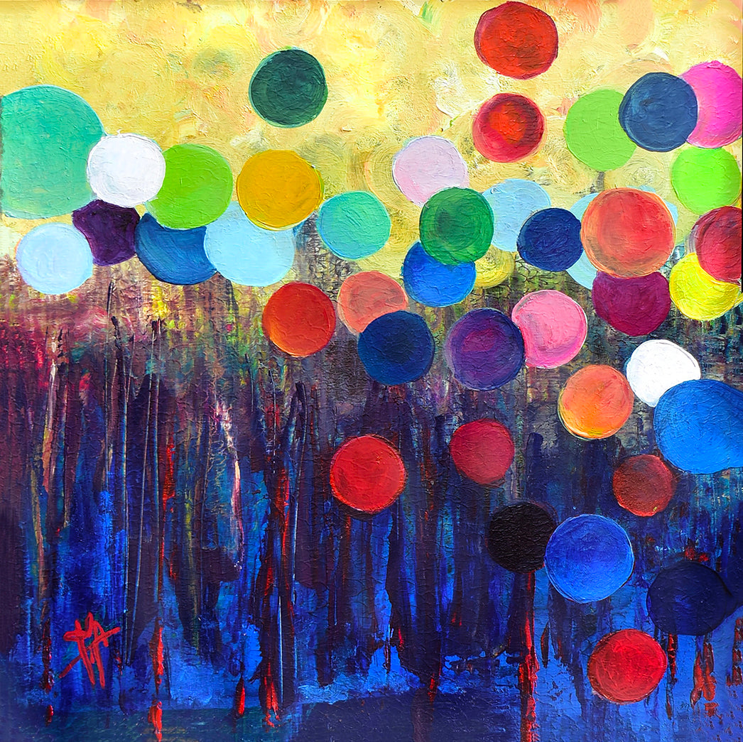 Painting is executed on 12x12x.75 inches wood panel, using Professional Acrylic paint, and is protected with a glaze of UV varnish and secured with hanging wire. This original painting is framed with a 1" black floating wood frame. It includes a Certificate of Authenticity (COA) and is signed by the artist on the back.