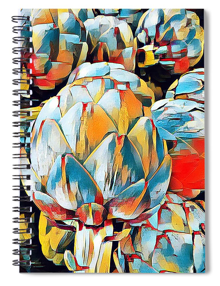 Our spiral notebooks are 6" x 8" in size and include 120 pages which are lined on both sides. The artwork is printed on the front cover which is made of thick paper stock, and the back cover is medium gray in color. The inside of the back cover includes a pocket for storing extra paper and pens.
