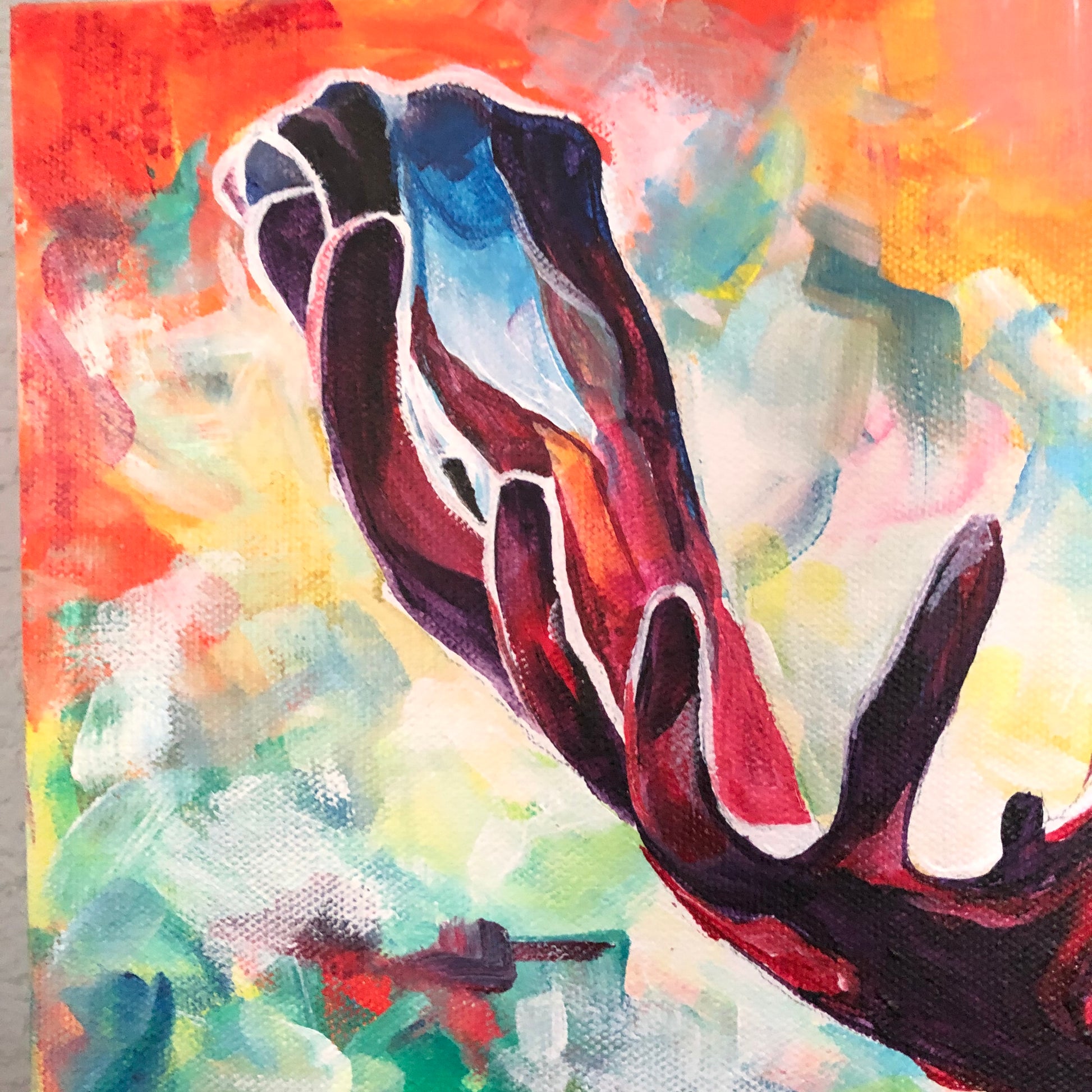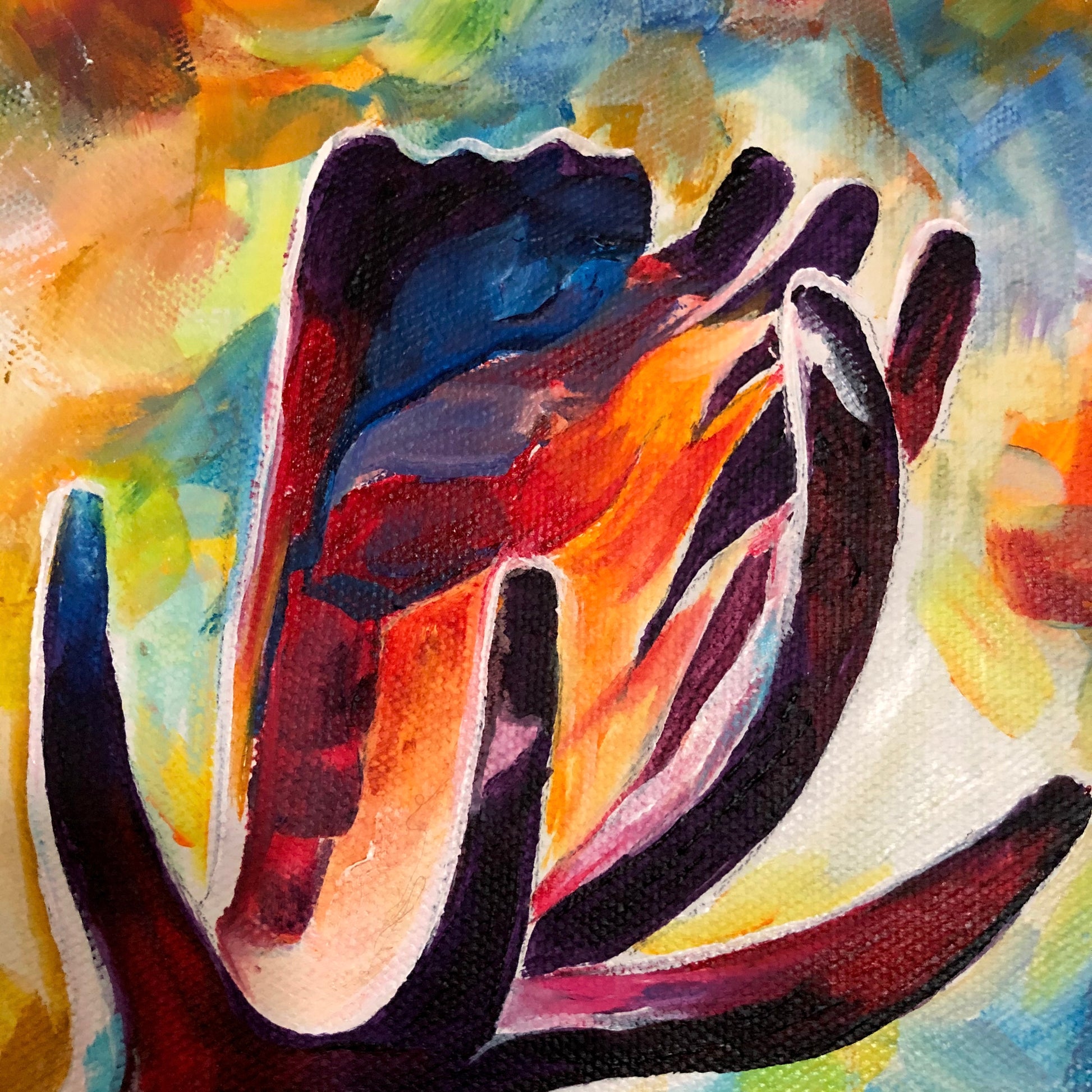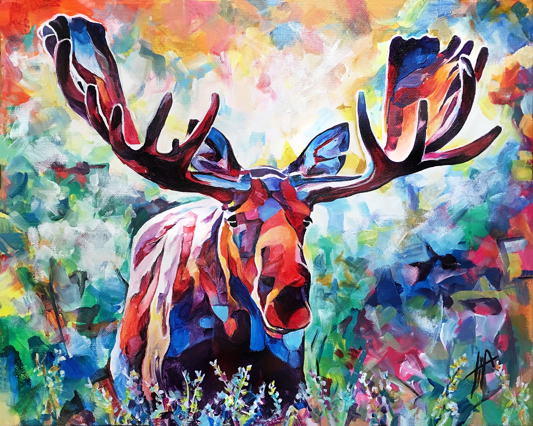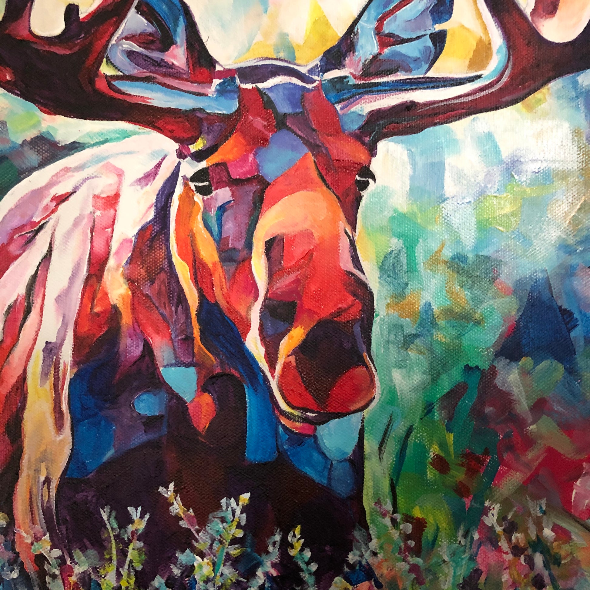 The early morning light radiates on this majestic moose as he forages for the new growth of leaves. This painting was created when the artist was applying for a summer residency in Alaska. After visiting Alaska in 2017 and seeing so many wild moose grazing in the wilderness, Tif was moved to paint one of these creatures in a most beautiful light and array of colors.