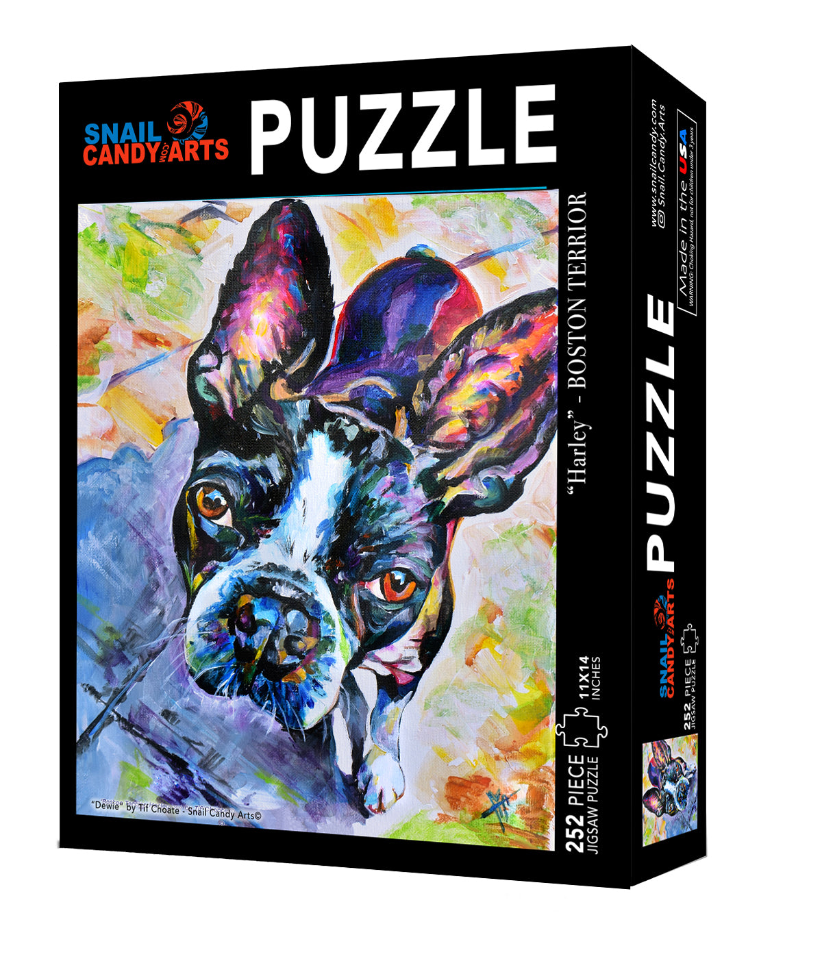 This puzzle depicts the original painting "Harley", a Boston Terrier dog portrait.