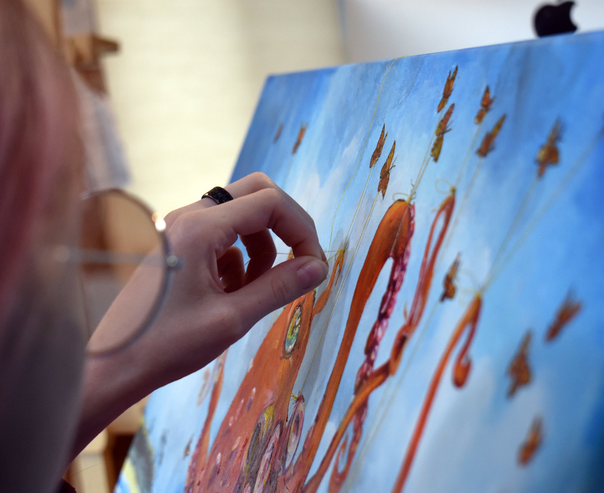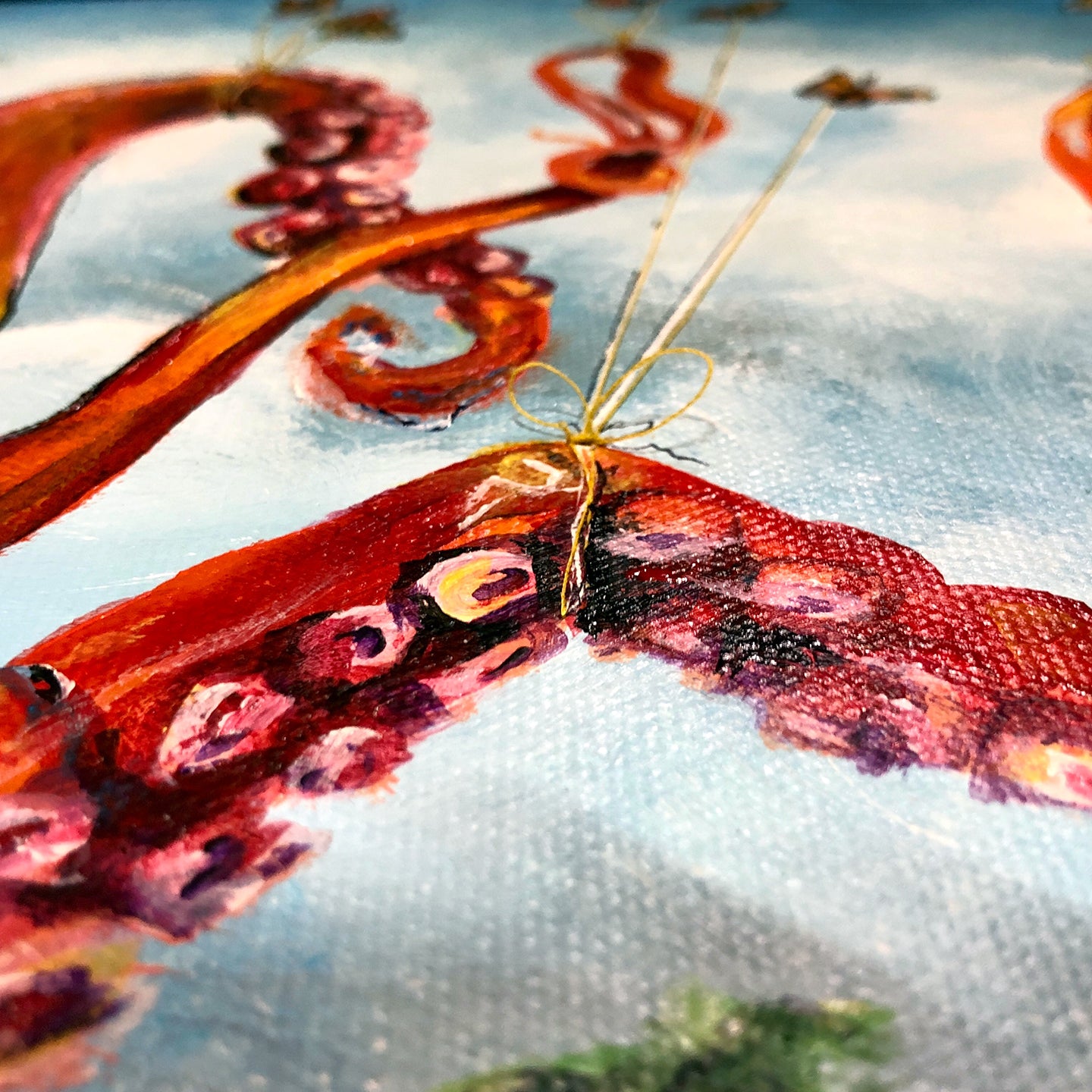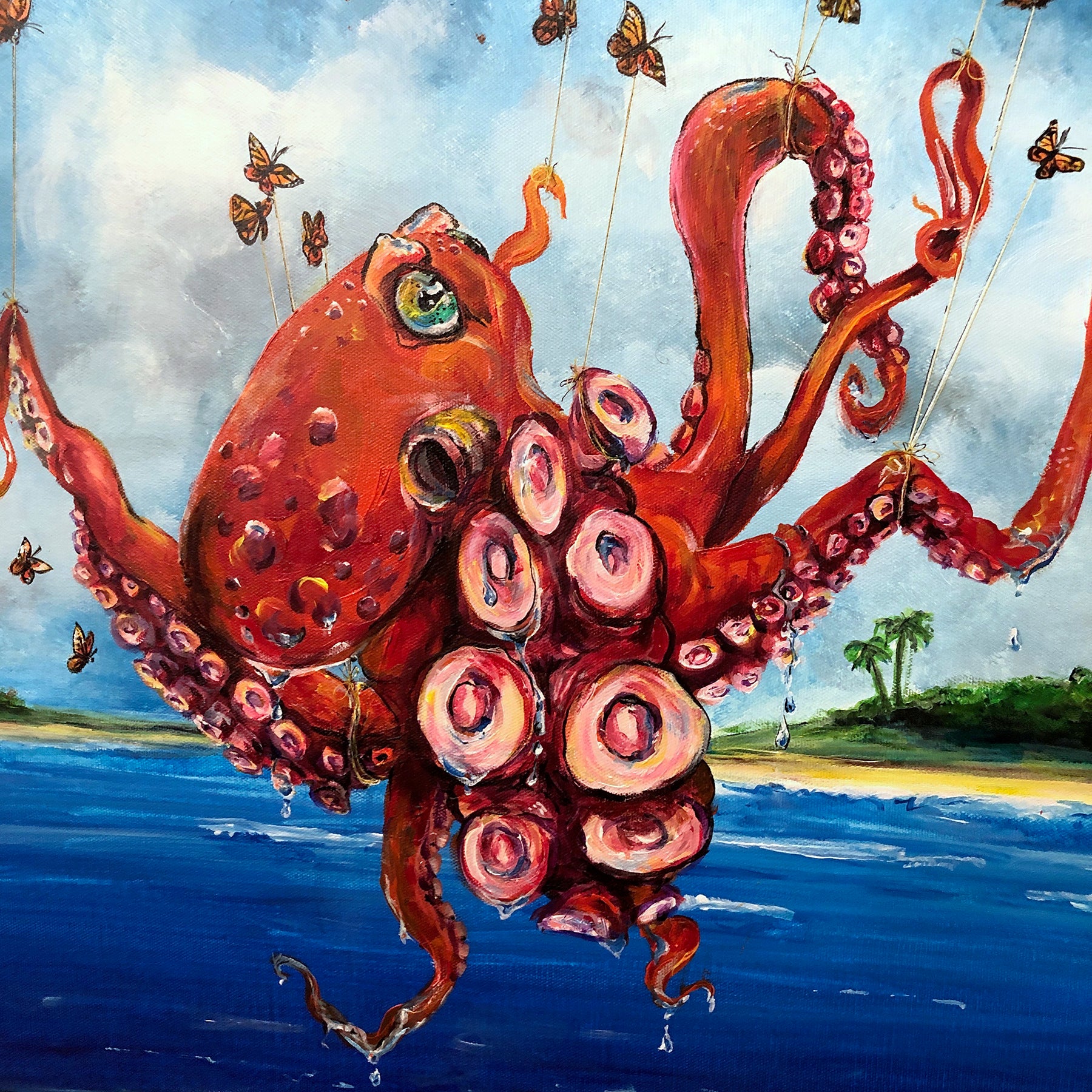 The painting "Migration" presents an imaginative alliance between monarch butterflies and giant Pacific octopuses, two species renowned for their extensive migratory journeys. Monarch butterflies embark on annual migrations spanning thousands of miles, traveling from North America to central Mexico. Similarly, certain populations of giant Pacific octopuses exhibit migratory behaviors, moving between deeper, cooler waters and shallower, warmer regions.