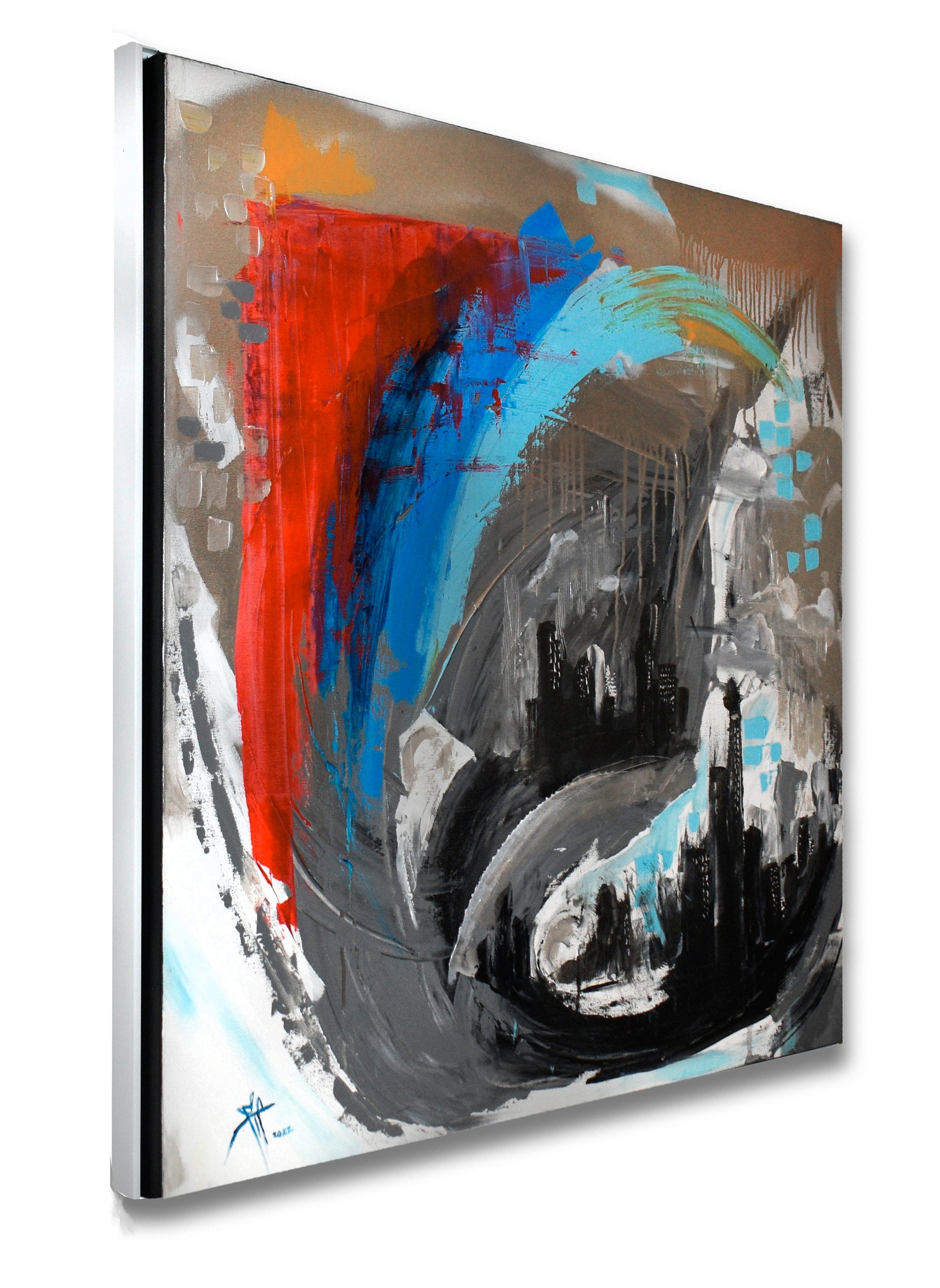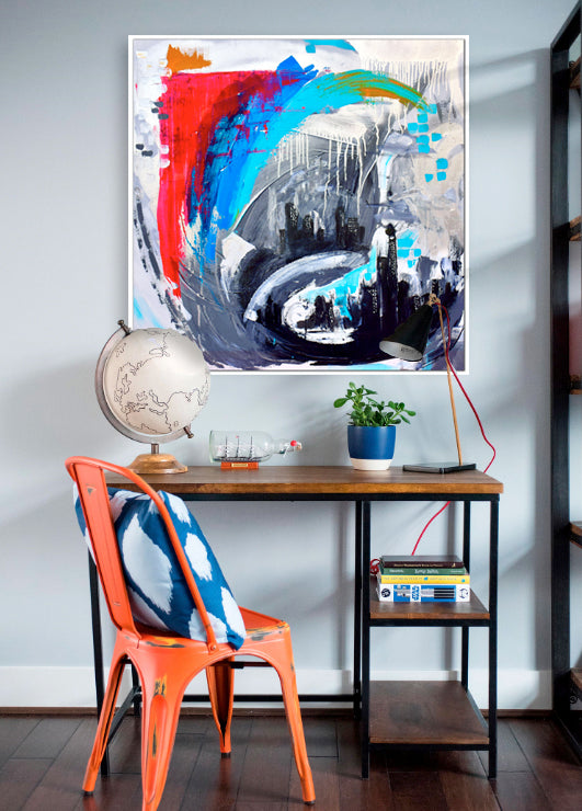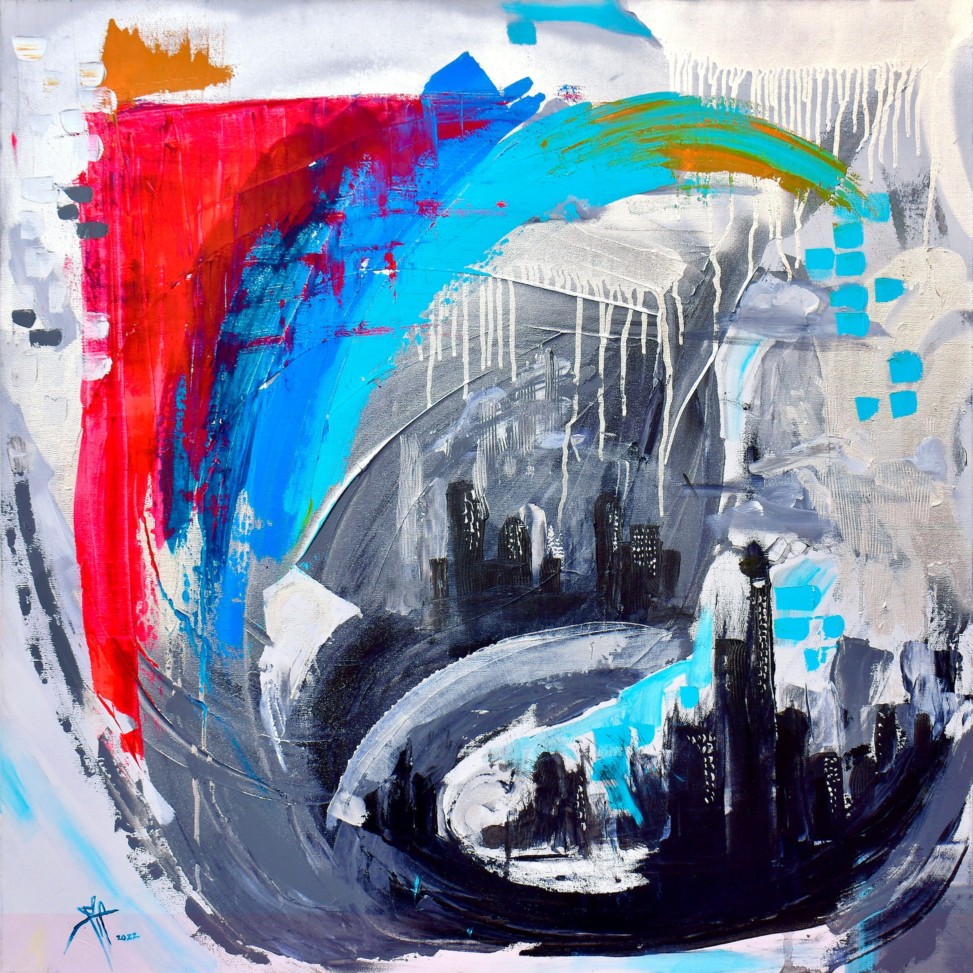 A maelstrom of emotion and energy, "Chicago Tempest" is an arresting spectacle of color and light. Varying light glints across the painting due to its iridescent silver finish, changing depending on the angle.