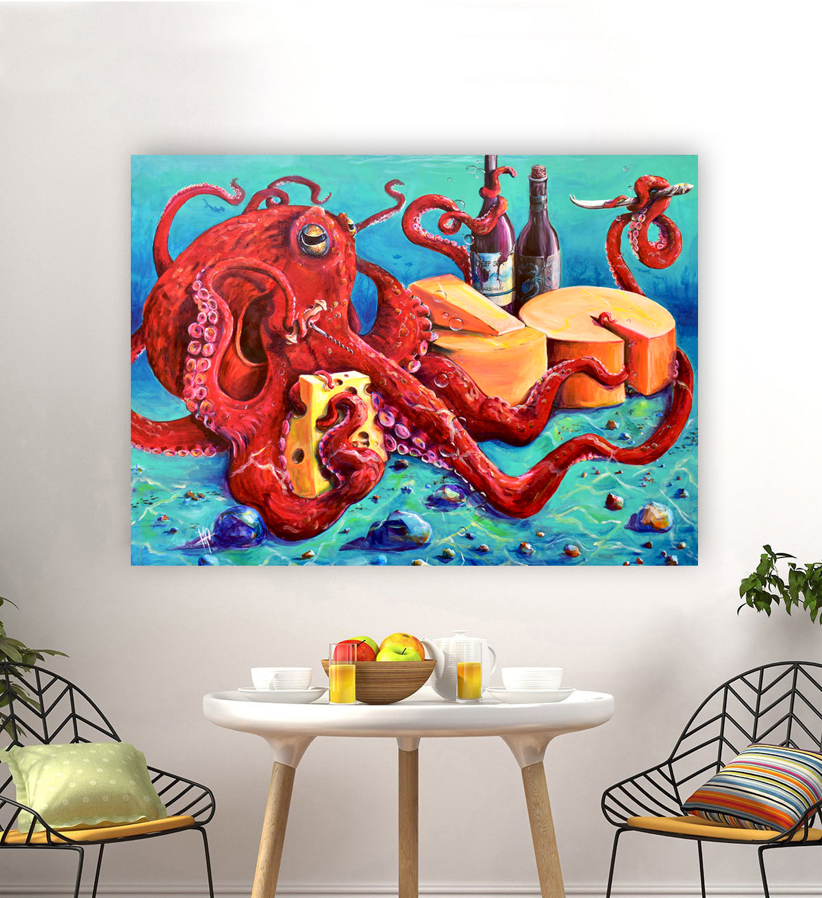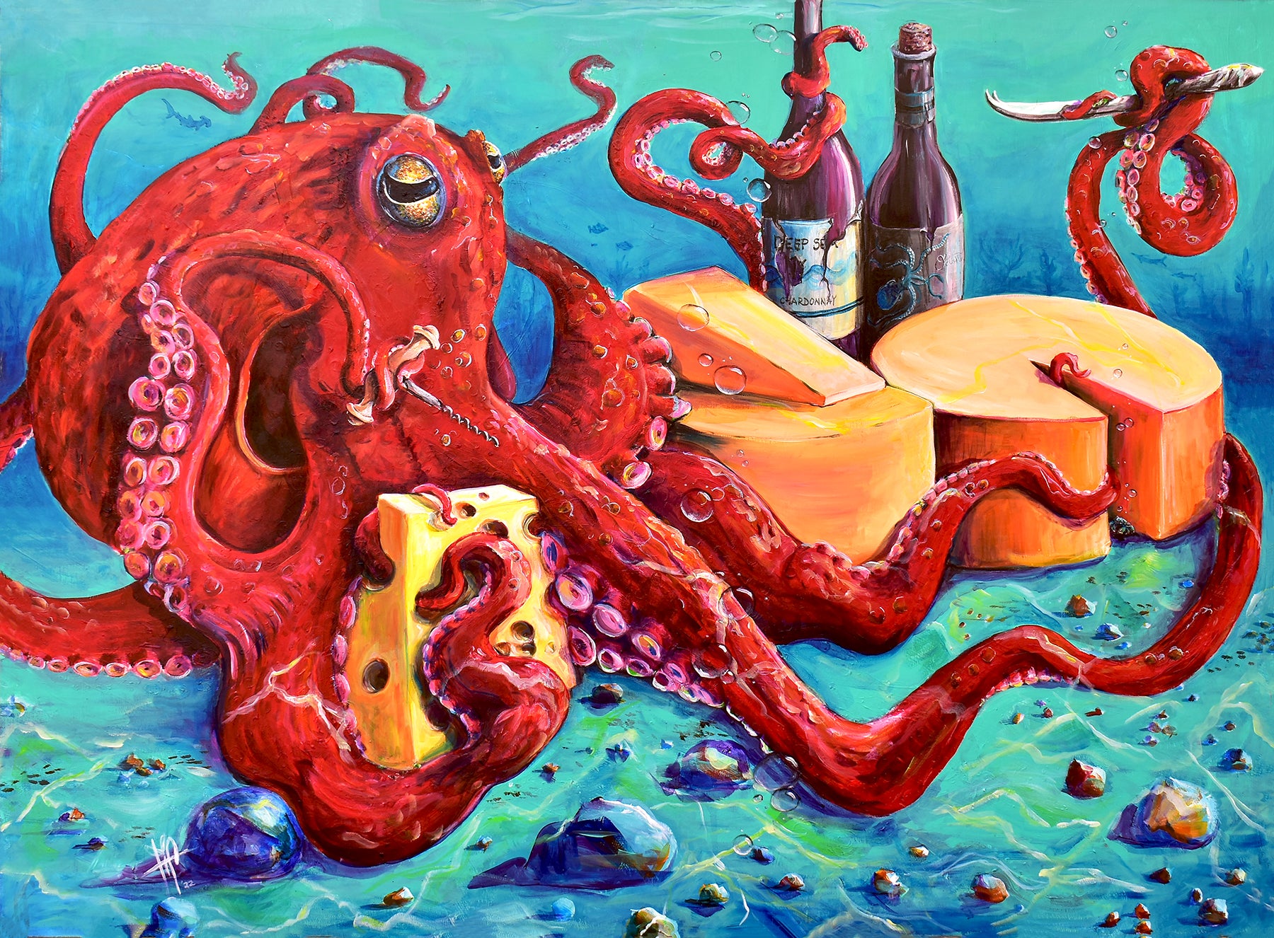 This delightful artwork features a Giant Pacific Octopus poised to savor a veritable banquet alongside its underwater comrades. With wine, cheese, and the necessary accoutrements, it appears poised to host a wonderful deep-sea soiree.