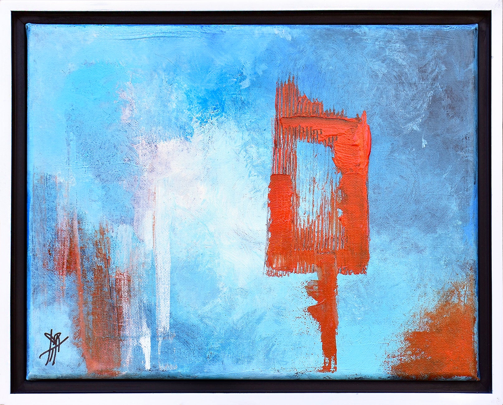 This unique work of abstract art is part of a limited series of five pieces. The artwork is created with acrylic paint on stretched canvas. Each piece measures 11" x 14" and is displayed in a sleek white floating frame with a black inset.