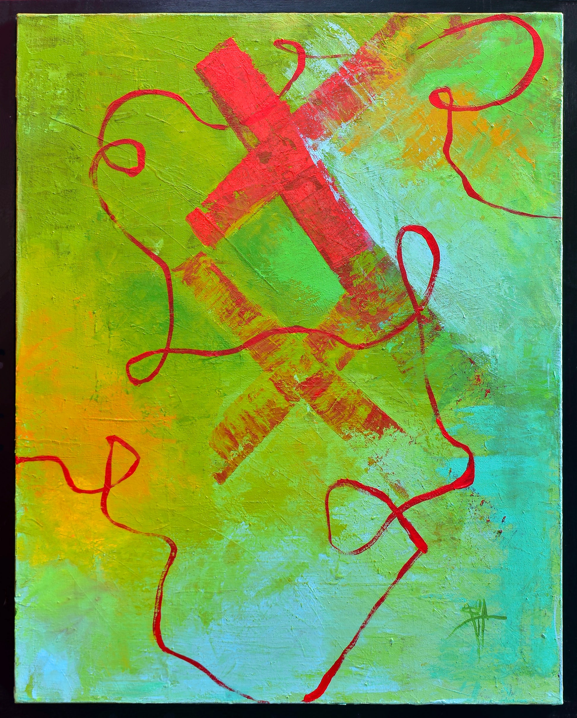This striking abstract design features a combination of bright azure, verdure, and scarlet contrasting slashes.