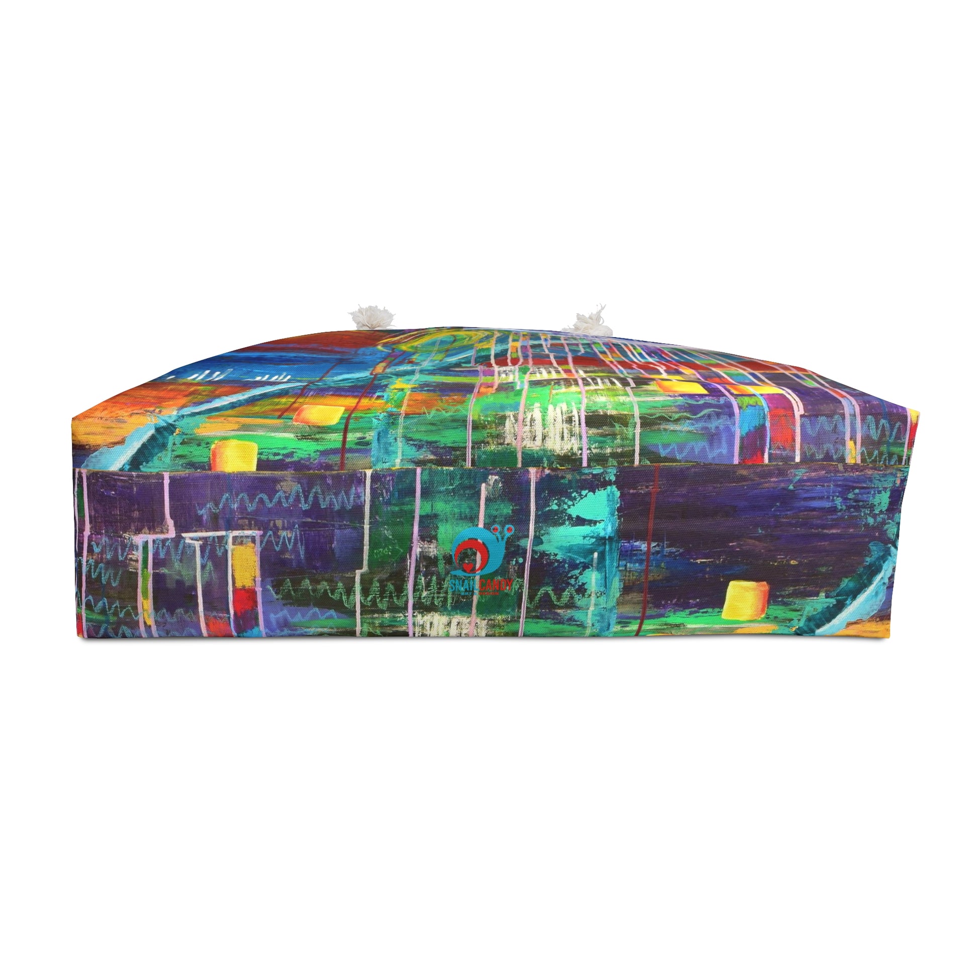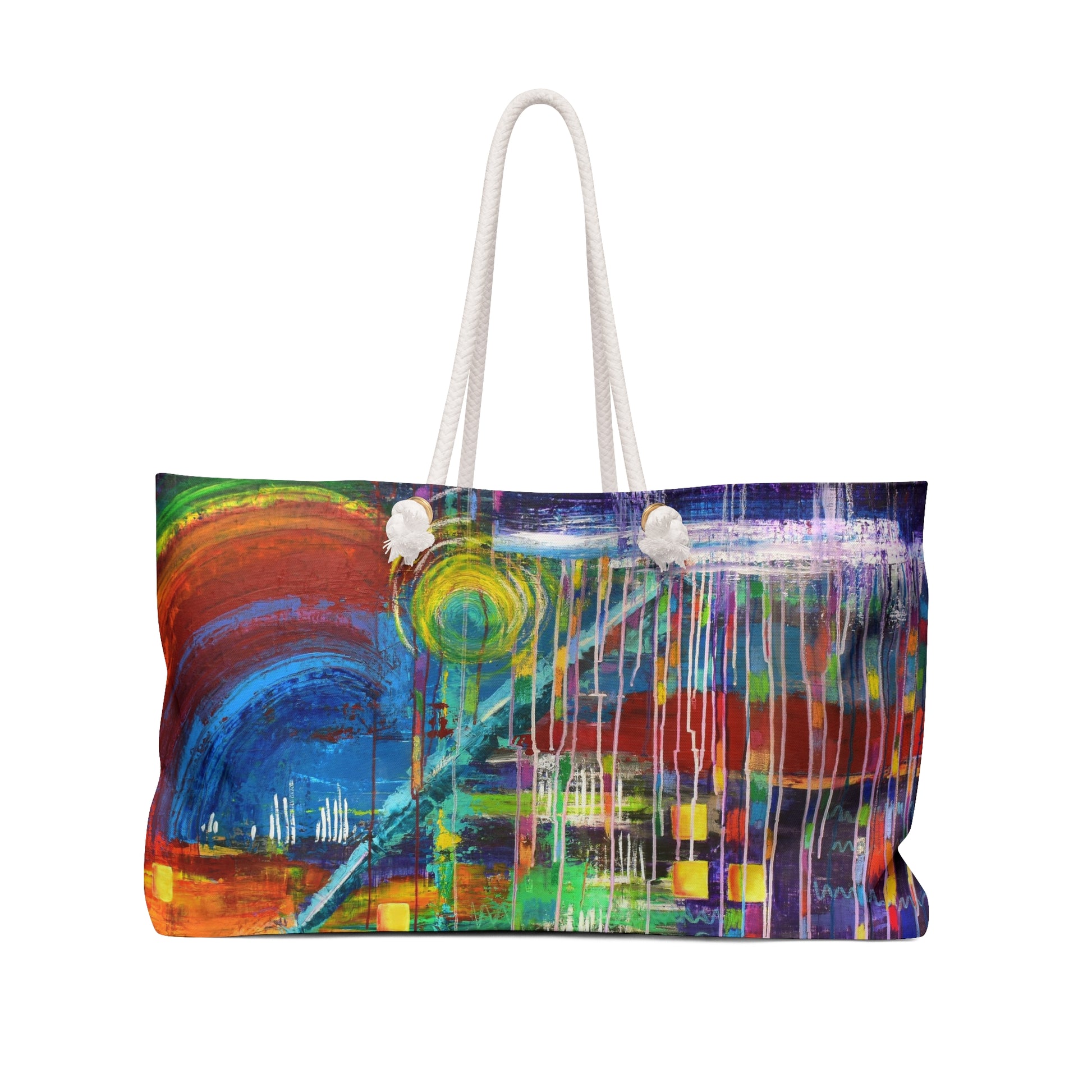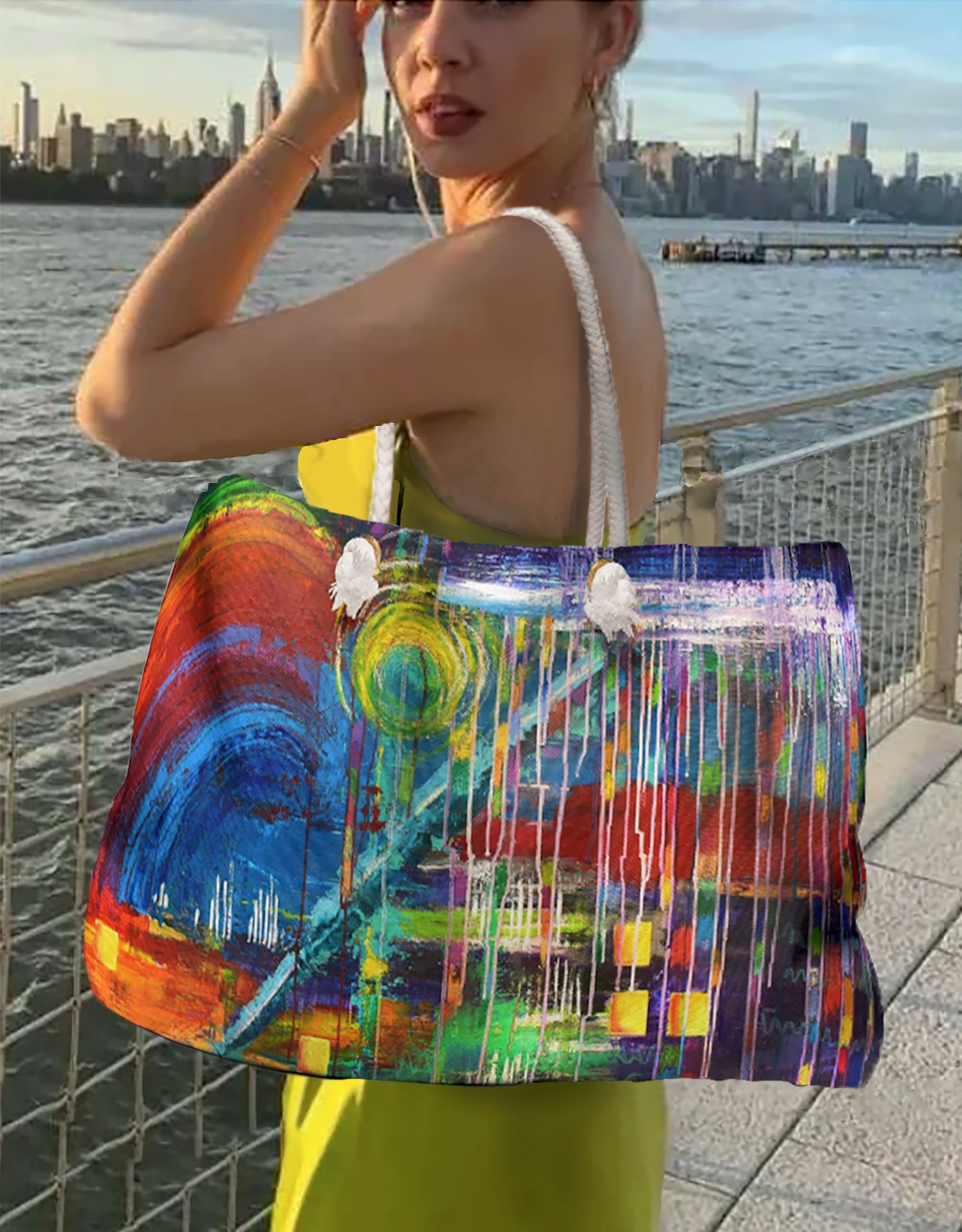 Art is printed on both sides of this bag. "Breakthrough" was crafted by Tif Choate 2023. This is a beautiful and colorful abstract, with a feeling of a clearing storm. The sky opens to a fresh view and a rainbow.
